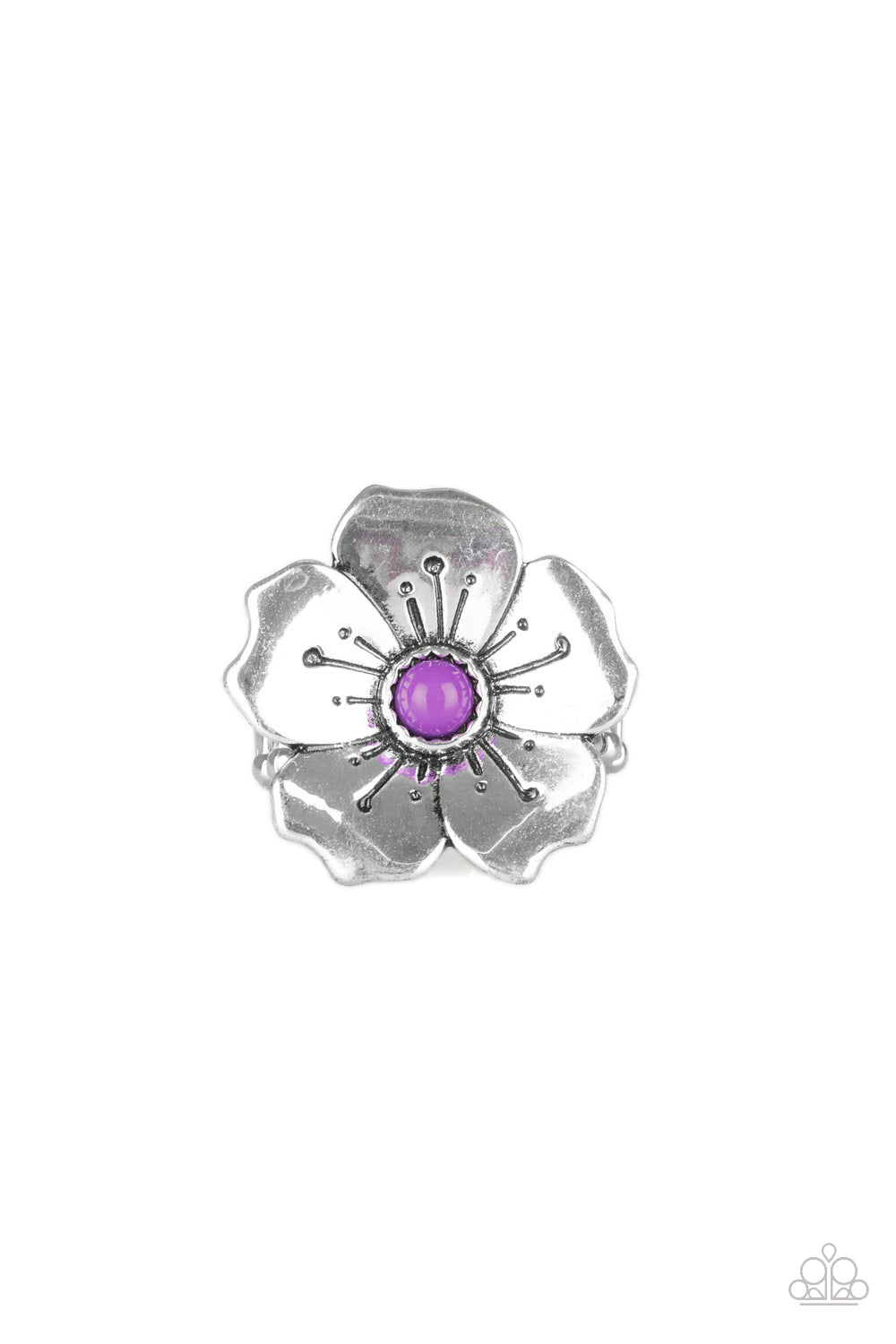 A bright purple bead is pressed into the center of a blooming silver flower radiating with antiqued details for a whimsical look. Features a stretchy band for a flexible fit.