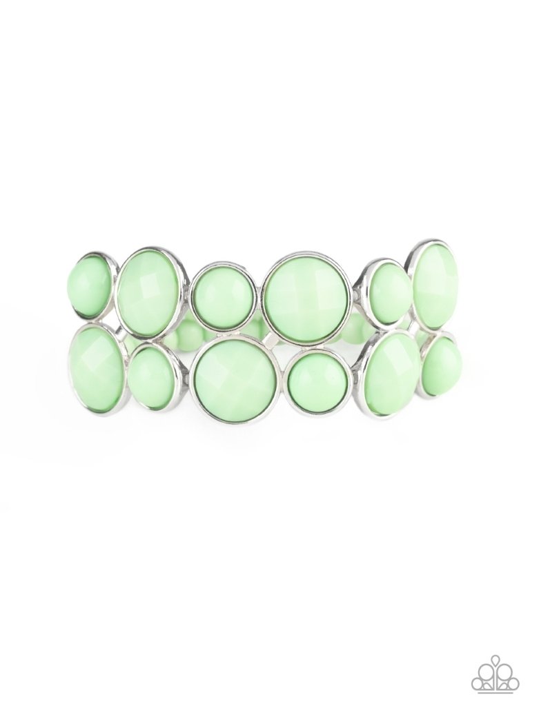 Dotted with smooth and faceted minty green beads, clustered silver frames are threaded along stretchy bands that split off into beaded rows around the wrist for a bubbly layered look.