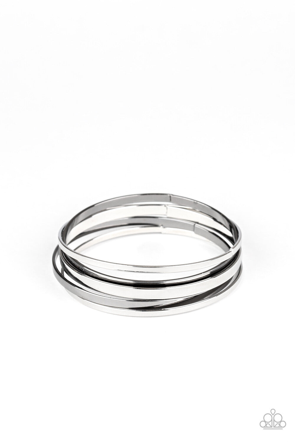 A collection of flat gunmetal and silver bangles stack along the wrist, creating an irresistible edgy shimmer.
