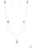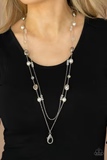 A dainty silver chain adorned in trios of iridescent flecked crystal-like beads layers with a chain dotted with matching crystal-like accents and imperfect silver and pearly white beads across the chest for a refined flair. A lobster clasp hangs from the bottom of the design to allow a name badge or other item to be attached. Features an adjustable clasp closure.
