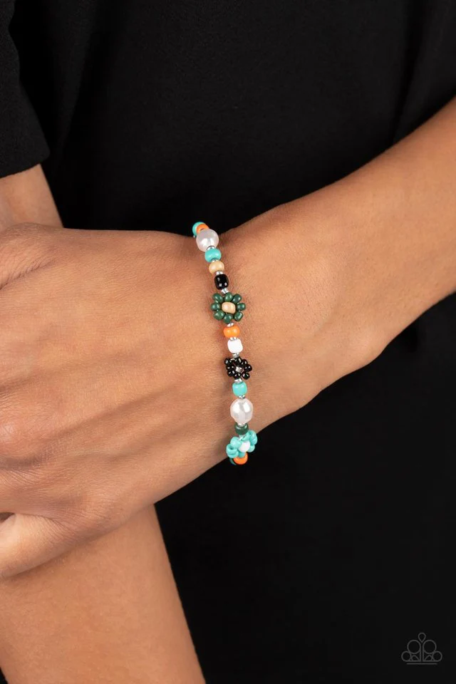 Modeled after gerber daisies, multicolored seed beed petals in shades of Tiffany, orange, olive green, and black bloom around white, Iced Coffee, and silver beaded centers resulting in a dazzling collection of florals around the wrist. Varying sizes of beads in the same shades, along with a couple of small baroque pearls, separate the floral designs in a far-out finish. Features an adjustable clasp closure.