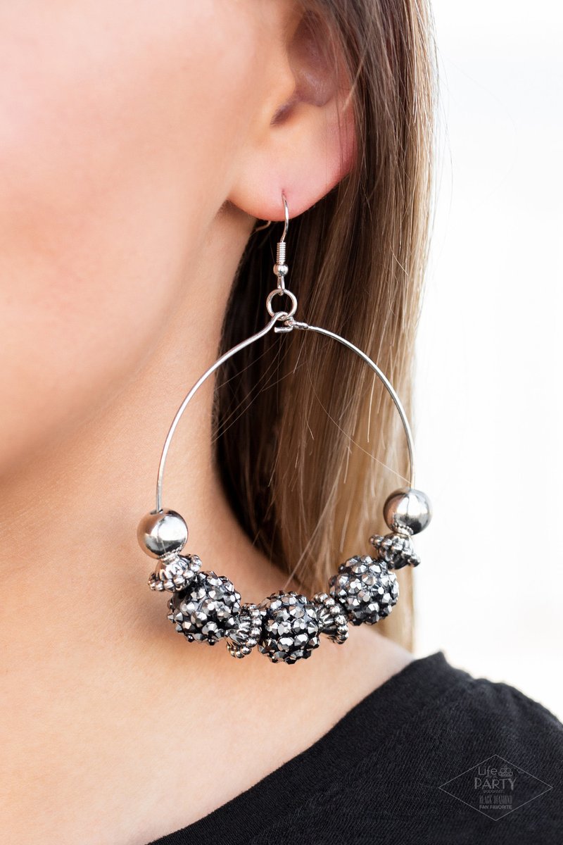 Vintage-inspired silver beads and hematite rhinestone covered spheres are threaded along a thin silver hoop.