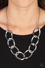 Attached to a classic silver chain, an oversized collection of warped oval links boldly interlocks below the collar for an intense industrial look. Features an adjustable clasp closure.