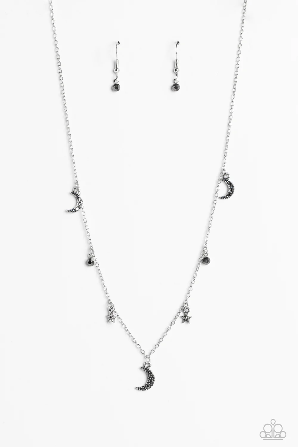 Dotted with dainty hematite rhinestones, a cosmic collection of silver moon and star charms swings from a dainty silver chain below the collar. Solitaire hematite rhinestones sparkle in between the charms, adding additional sparkle to the piece. Features an adjustable clasp closure.