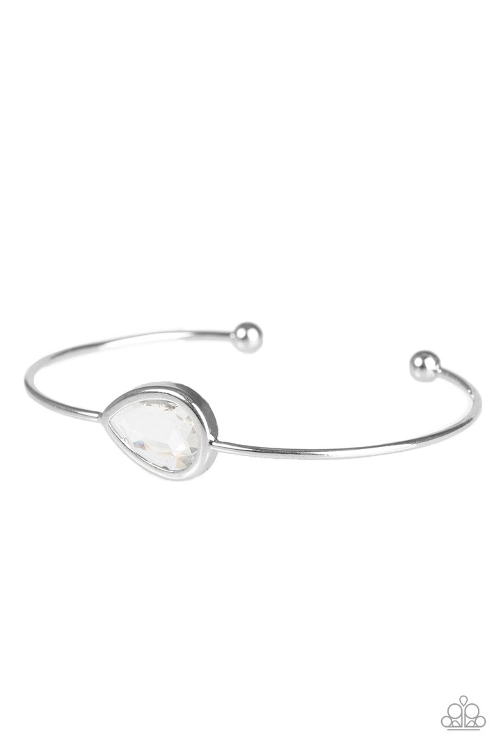 A glassy white gem is pressed into a teardrop fitting in the center of a dainty silver cuff for a refined look.