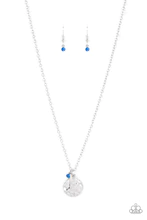 A hammered silver disc, rectangular silver frame, and glittery blue rhinestone swings from the bottom of a dainty silver chain, creating a whimsically layered pendant below the collar. Features an adjustable clasp closure.