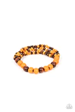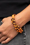 Stretchy strands of dainty brown and orange wood beads attach to a single strand of oversized brown and orange wood beads, resulting in colorful layers around the wrist.