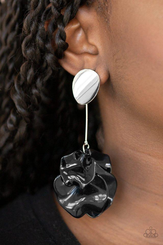 Curving black acrylic petals dangle from the end of a bar attached to the bottom of a delicately bent silver disc, creating a colorfully clustered lure. Earring attaches to a standard post fitting.