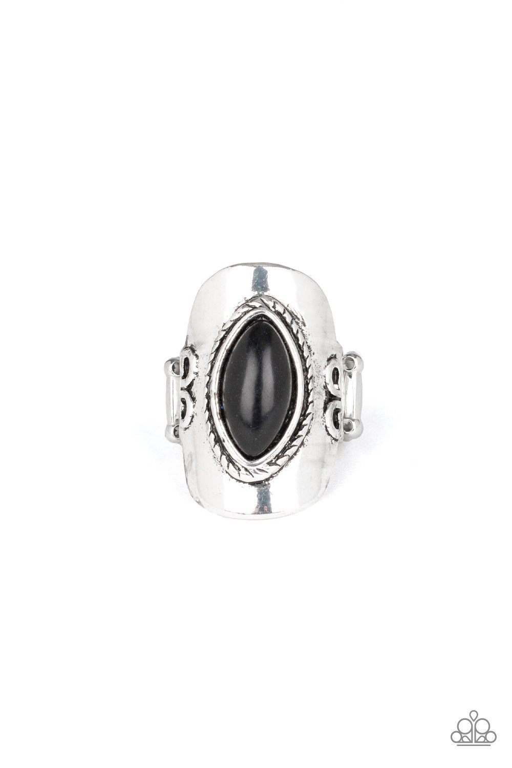 Chiseled into a tranquil marquise shape, an earthy black stone is pressed into the center of an ornate silver frame as it folds around the finger. Features a stretchy band for a flexible fit.