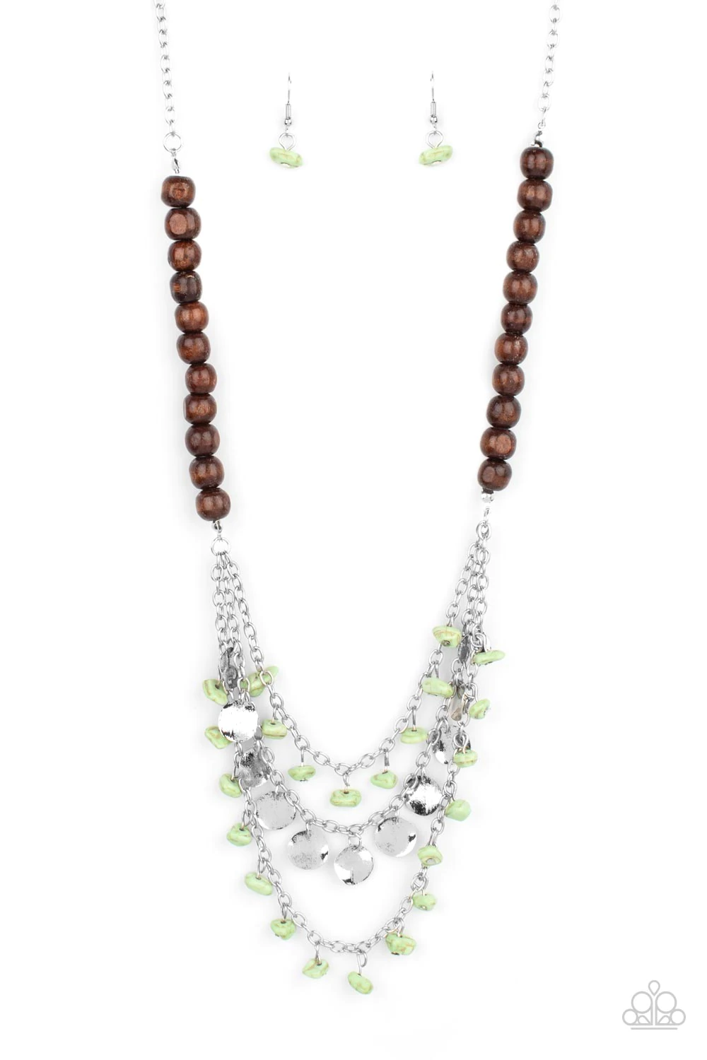 Adorned with green pebbles and hammered silver discs, three silver chains layer from strands of brown wooden beads, creating an earthy fringe below the collar. Features an adjustable clasp closure.