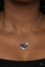 A glitzy collection of dainty silver studs, an emerald cut purple gem, and smoky and white marquise cut rhinestones delicately coalesce into a clustered pendant, resulting in a timeless sparkle below the collar. Features an adjustable clasp closure.