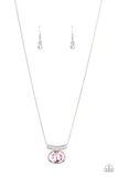 Encased in a glistening silver fitting, an oval pink gem attaches to a silver bar encrusted in glassy white rhinestones that delicately glides along a silver round snake chain below the collar for a timeless fashion. Features an adjustable clasp closure.
