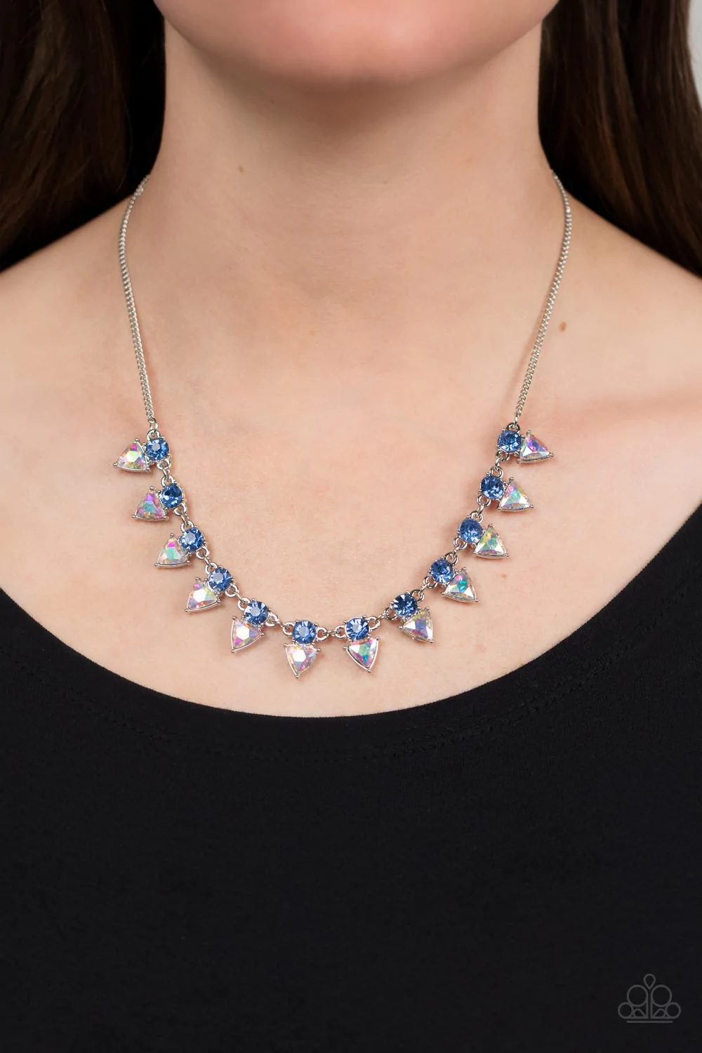 Solitaire blue rhinestones sparkle atop iridescent prism-like gems below the collar, linking into a sharp-looking statement piece. Features an adjustable clasp closure. Due to its prismatic palette, color may vary.