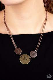 Individually stamped in Let, Your Light, Shine, a pair of rustic copper discs and a single brass disc, combining into an inspirational phrase below the collar. Features an adjustable clasp closure.