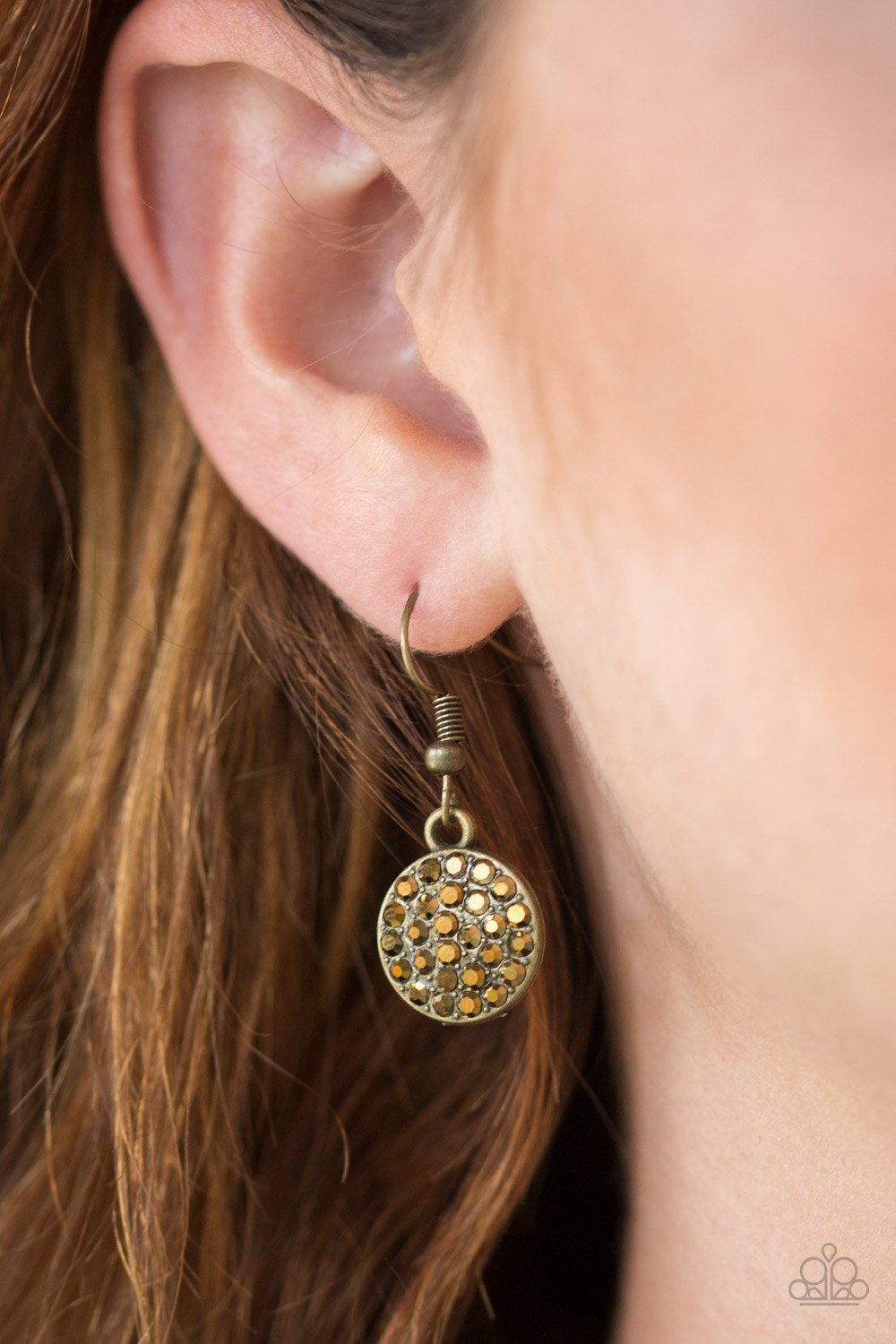 Encrusted in glittery aurum rhinestones, a dainty brass disc swings from the bottom of a glistening brass chain for a classic look. Features a toggle closure.