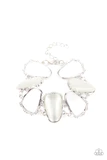 Encased in studded silver frames, a tranquil collection of asymmetrical white cat’s eye stone teardrops and airy silver frames delicately link around the wrist for an ethereally sparkly display. A sprinkling of rhinestones accent the open frames, adding a touch of elegance to the piece. Features an adjustable clasp closure.