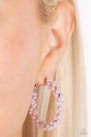 A dainty strand of baby pink pearls is delicately wrapped around a classic silver hoop, creating bubbly refinement. Earring attaches to a standard post fitting. Hoop measures approximately 1 1/2" in diameter.